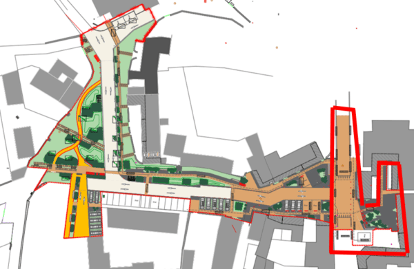 L’espace restera accessible à vitesse réduite aux véhicules des riverains (des allées seront dessinées à travers les espaces verts vers les maisons en bordure) et à ceux des usagers du secteur (se rendant à la salle des fêtes, à la maison médicale, dans les commerces).