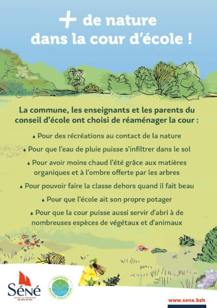 - remplacer une partie de la surface bitumée par un espace perméable aux eaux de pluie, apportant ombre et fraîcheur, grâce à des aménagements naturels simples mais ludiques.