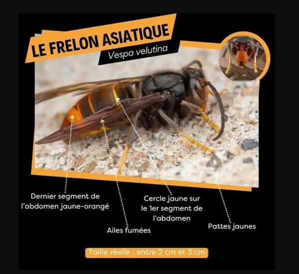 Le frelon asiatique, ou Vespa velutina, est une espèce invasive originaire d’Asie. Il se distingue par son corps noir et jaune, avec des pattes jaunes qui lui donnent un aspect particulier. Sa taille est généralement plus petite que celle du frelon européen, mesurant environ 2,5 à 3 cm de long.