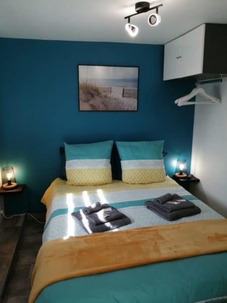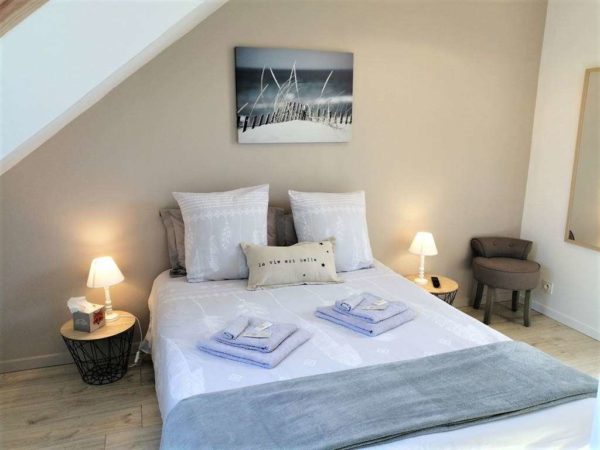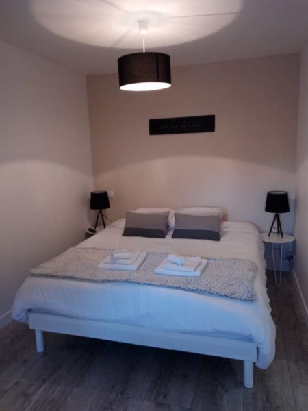 A l’étage : une mezzanine avec télévision et console de jeux, une belle et grande chambre avec WC et lavabo privés.