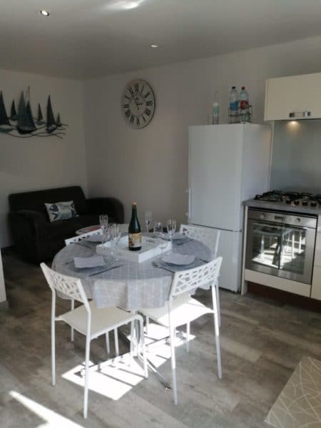 Au rez-de-chaussée : une pièce de vie avec une cuisine toute équipée et un petit coin salon, une chambre et une salle d’eau avec WC.