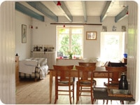 Maison : Au RDC : 1 chambre avec lit double 140 x 160, 1 piano ; 1 chambre avec lit double 160 x 200. 1 salle de bain baignoire ; 1 WC ; cuisine ouverte sur le salon ; salon avec cheminée ; 1 lingerie.