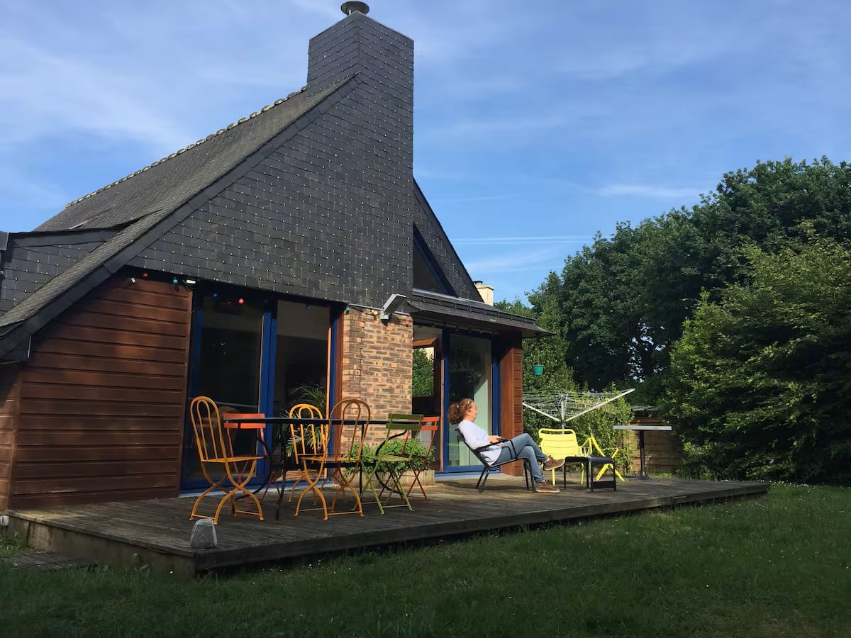 Au cœur du bourg de Séné, au bord du Golfe du Morbihan, maison en bois indépendante et sa terrasse donnant sur un joli jardin ouvrant sur les arbres, comme dans une clairière, sans vis à vis et très calme.