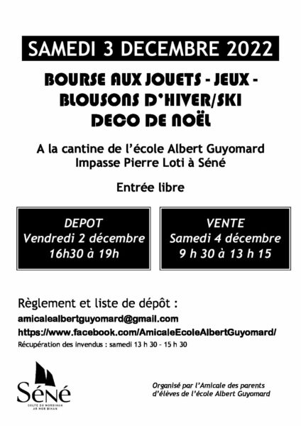 Pour la deuxième année consécutive, pour collecter des fonds, l’amicale organise une bourse aux jouets, jeux, vêtements de ski et blousons d’hiver le samedi 3 décembre 2022 à la Cantine de l’école Albert Guyomard