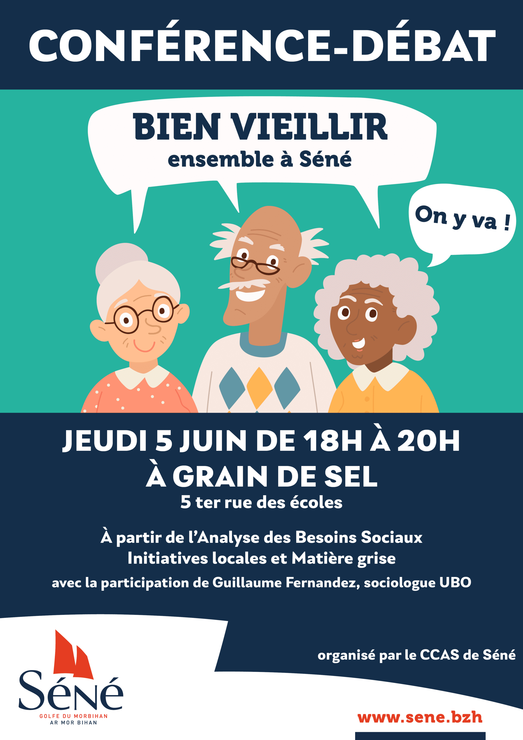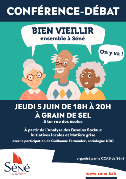 Dans la continuité de l’Analyse des Besoins Sociaux (ABS) Bien vieillir à Séné, les élu(e)s et l’équipe du C.C.A.S. vous invitent à une Conférence Débat à Grain de Sel à Séné le 5 juin prochain de 18h00 à 20h00.