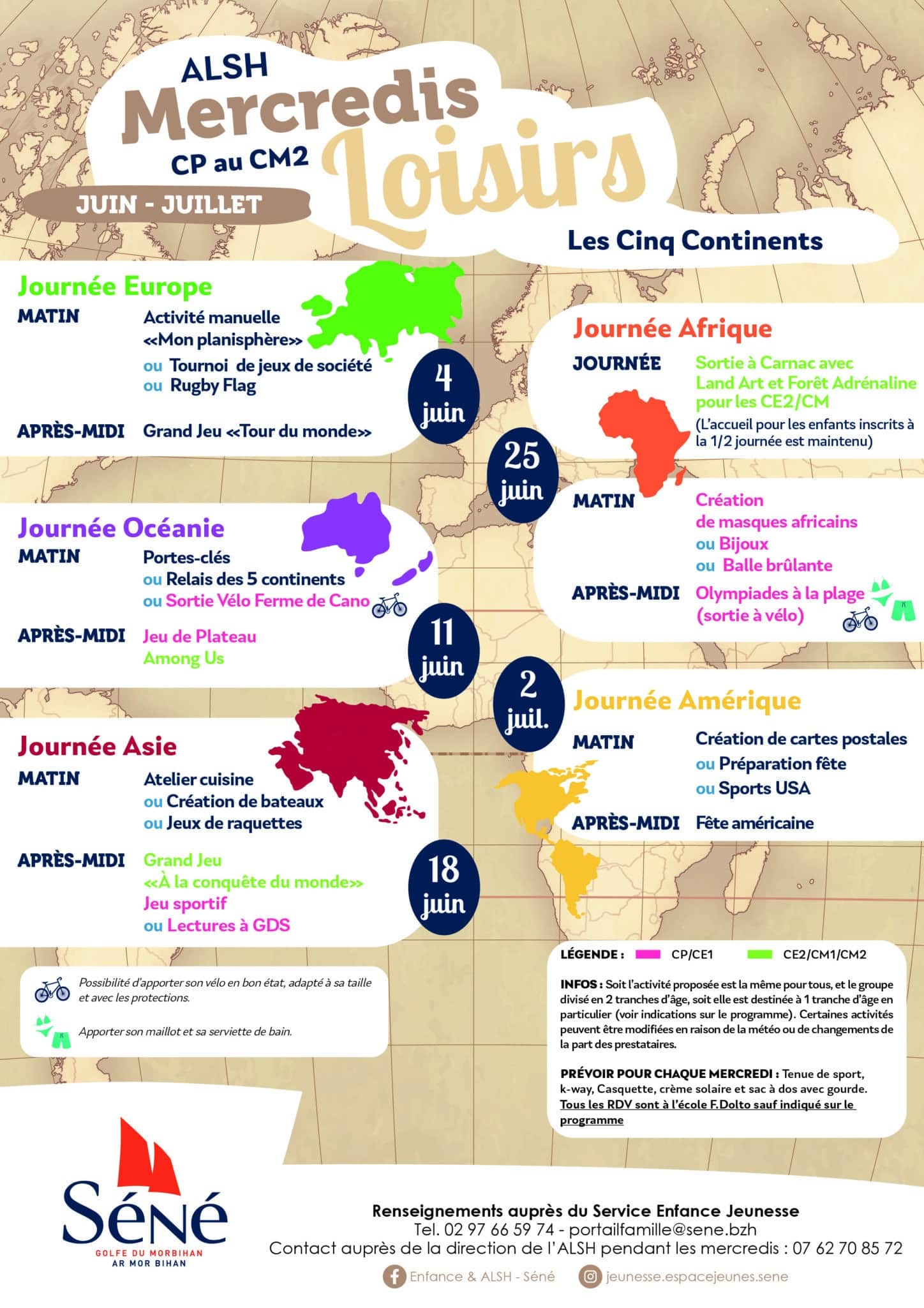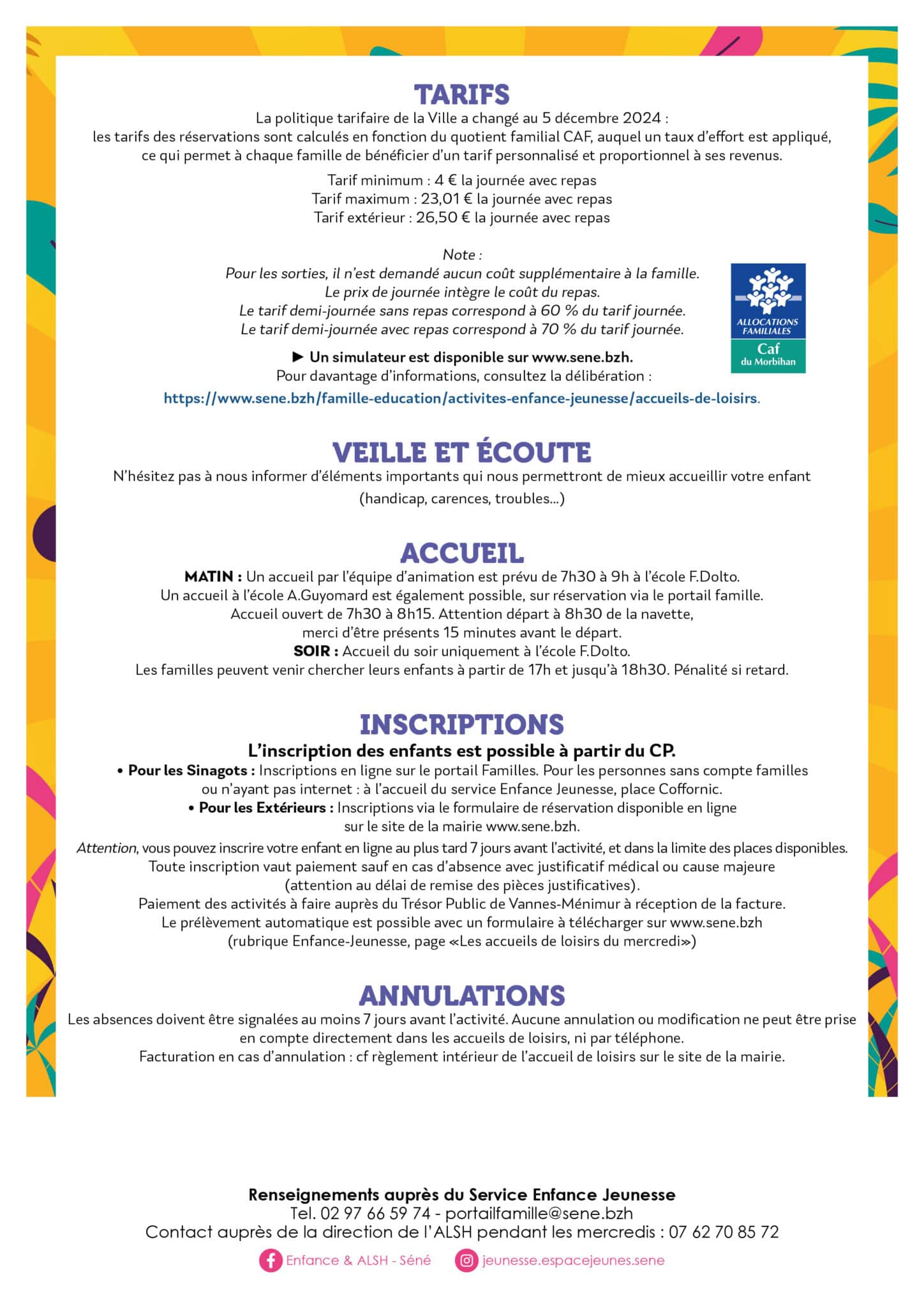 Les accueils de loisirs du mercredi fonctionnent en période scolaire pour les enfants sinagots ou les enfants extérieurs scolarisés dans les écoles de Séné. Les autres familles extérieures peuvent s’inscrire s’ils restent des places disponibles.