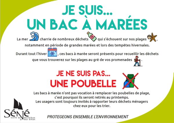La Ville de Séné expérimente, à l’hiver 2020, des bacs à marées (réalisés par les services techniques à partir de bois de palettes), sur trois plages de la commune : la Pointe du Bill, Moustérian, Montsarrac. Cette expérimentation a pour objectif d’encourager les passants à ramasser les déchets charriés par la mer au cours de leur promenade. Ces bacs, qui sont vidés toutes les semaines, arborent un message explicatif pour ne pas être confondus avec des poubelles de plage.