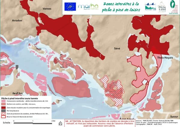 Sur les zones matérialisées sur la carte ci-dessous, la pêche à pied de loisir est interdite (ainsi que la pêche à la ligne dans la Réserve Naturelle).
