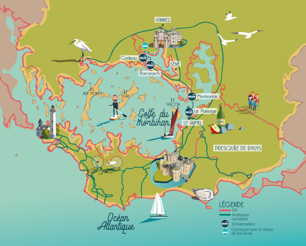 Pour une grande balade : embarquez sur le Petit Passeur à Conleau (Vannes) et rejoignez Barrarac’h (Séné), puis empruntez les voies cyclables pour une balade de 7 km jusqu’à Montsarrac, où vous prenez le second Petit Passeur pour rejoindre Saint-Armel sur la presqu’île de Rhuys.