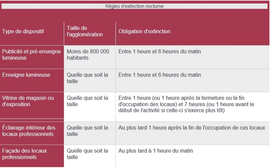 Consultez le tableau récapitulatif des règles d’extinction nocturne.