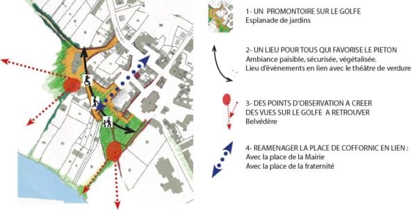 L’étude du site a permis d’identifier un relief de type promontoire en fond de place, offrant plusieurs points de vue sur le Golfe oubliés et actuellement plus ou moins cachés.