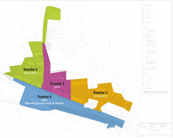 Les tranches 1 et 2 comportent 147 logements, dont 43 en locatif social. Le bâtiment Nouvelle Vague en bordure de la route de Nantes accueille également 5 cellules commerciales.