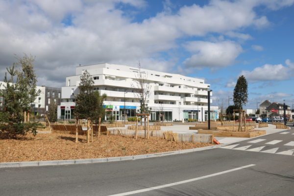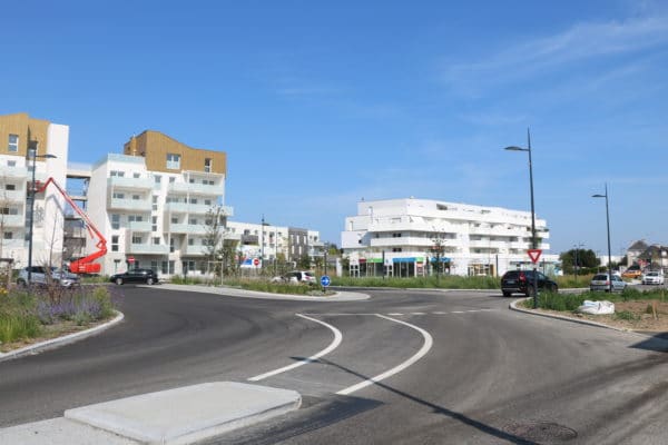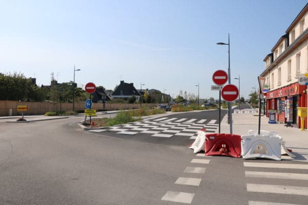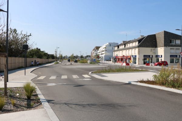 La route de Nantes, bordée sur cette section de tout nouveaux collectifs d’habitation, passe en zone 30, avec un passage protégé et surélevé au niveau de la place centrale.