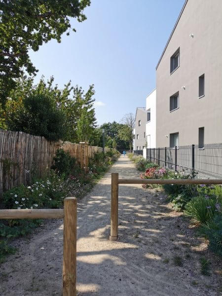 L’idée était ici de créer un couloir vert, parenthèse végétale et fleurie entre les deux quartiers. Ainsi, un bardage bois complète la clôture en béton existante, afin de conserver l’intimité des pavillons côté est. Il est agrémenté d’une palissade en châtaignier pour accueillir des plantes grimpantes. Une haie d’arbustes et de vivaces borde de chaque côté l’allée réalisée en sablé et ponctuée de luminaires à faible consommation d’énergie. Les 400 m² de massifs sont composés de : 65 plantes grimpantes (clématites, jasmin étoilé, solanum), 2 charmes, 25 petits arbres, 160 arbustes, 1000 vivaces.