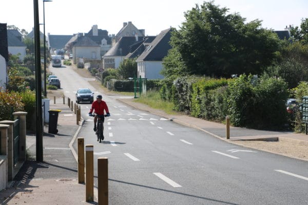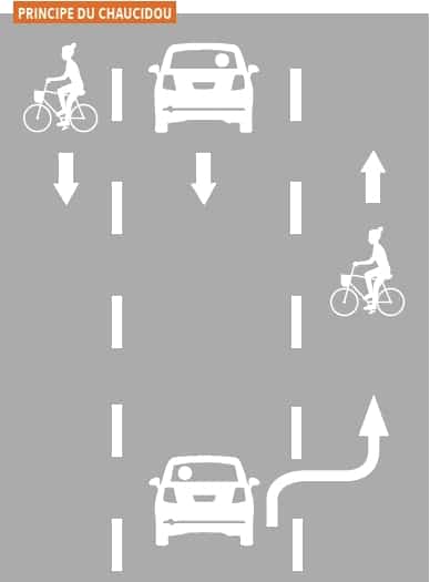 La voie centrale ne peut permettre le passage que d’une seule voiture. Elle est bordée de part et d’autre par deux bandes cyclables. Pour croiser un autre véhicule en présence de vélos, une voiture doit donc se ranger derrière eux pour leur laisser la priorité.